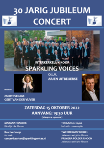 Op 15 oktober 2022 viert Sparkling Voices haar 30-jarig jubileum, i.v.m. de coronapandemie 1 jaar later, op grootse wijze met een jubileumconcert in de Maranathakerk te Rhoon.