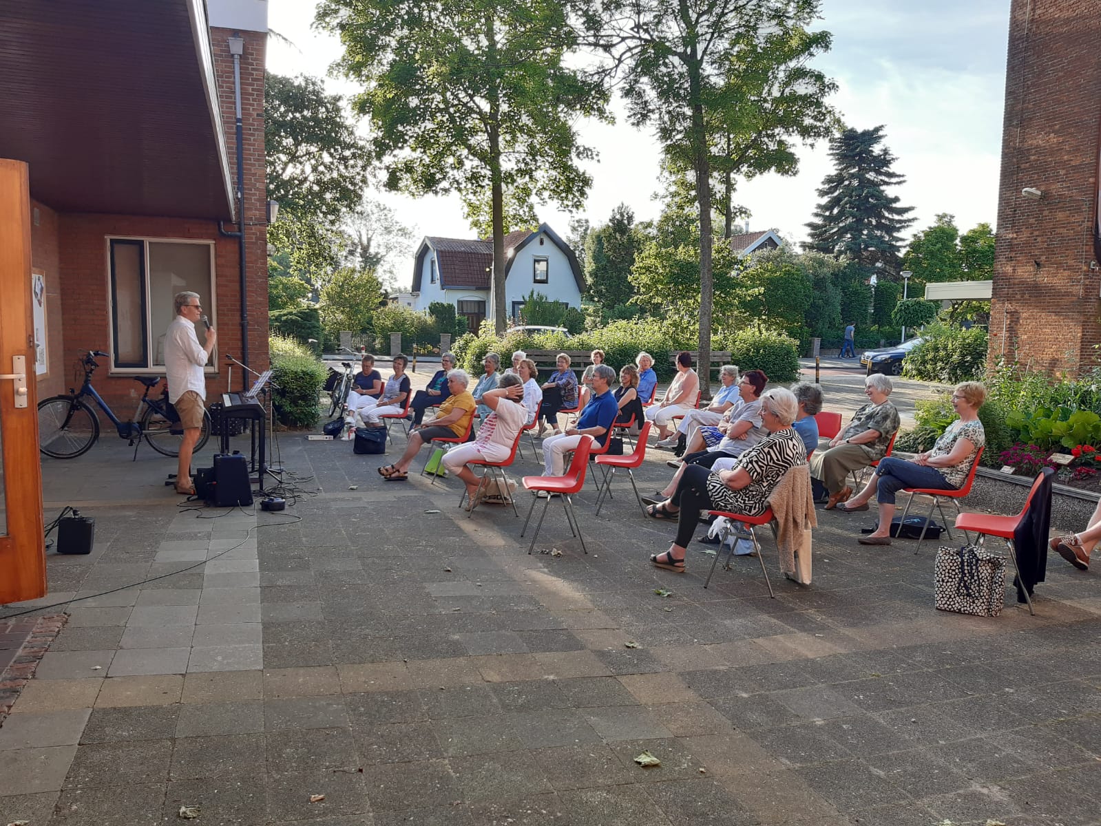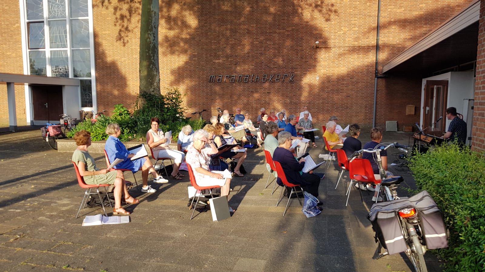 Zolang het weer daar gelegenheid voor biedt, blijven we de komende tijd op het plein voor de Maranathakerk repeteren, zodra de beperkingen voor het zingen binnen worden opgeheven, zullen we dat weer ín de kerk gaan doen.