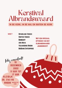 De gemeente Albrandswaard en het Akkoord van Albrandswaard organiseren voor 10 december aanstaande voor de eerste keer een Kerstival Albrandswaard in en rondom de Maranathakerk in de dorpskern Rhoon.